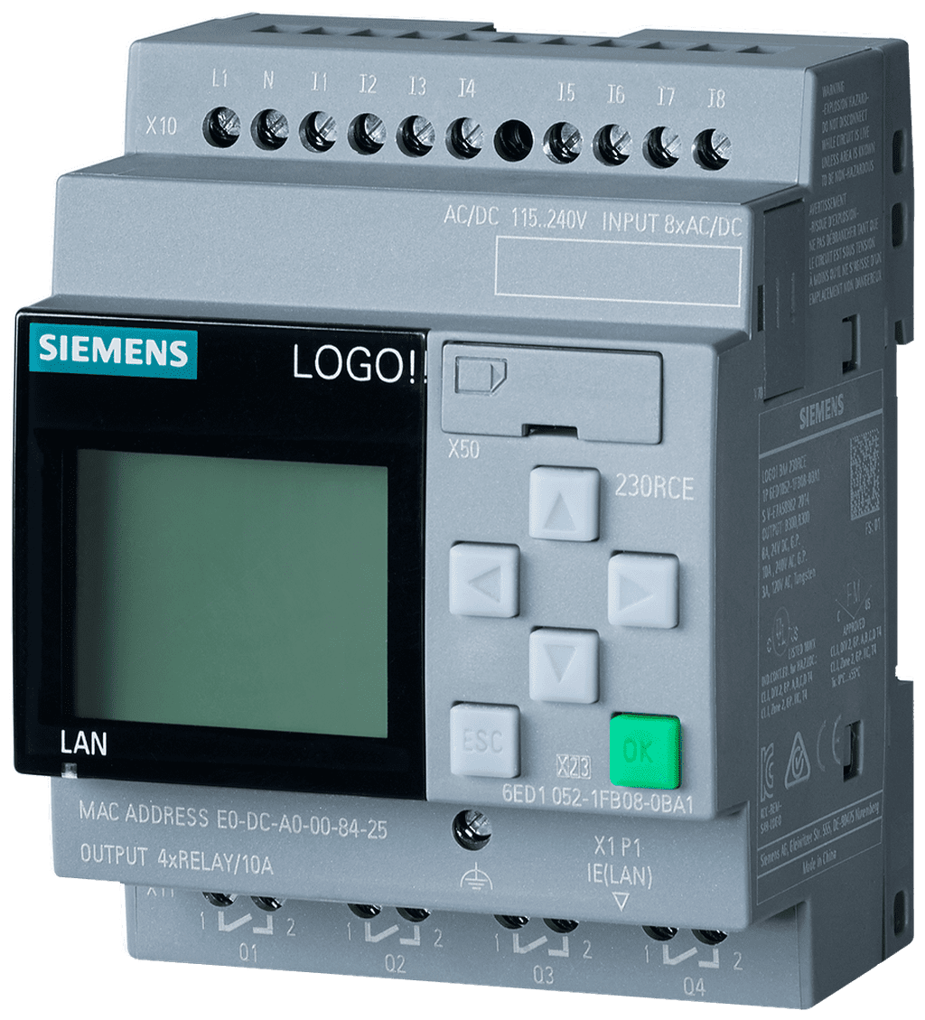LOGO! 230RCE,logic module, display PS/I/O: 115V/230V/relay, 8 DI/4 DO, memory 400 blocks, modularly expandable, Ethernet, integr. web server, data log, user-defined web pages, standard microSD card for LOGO! Soft Comfort V8 or higher, older projects executable
