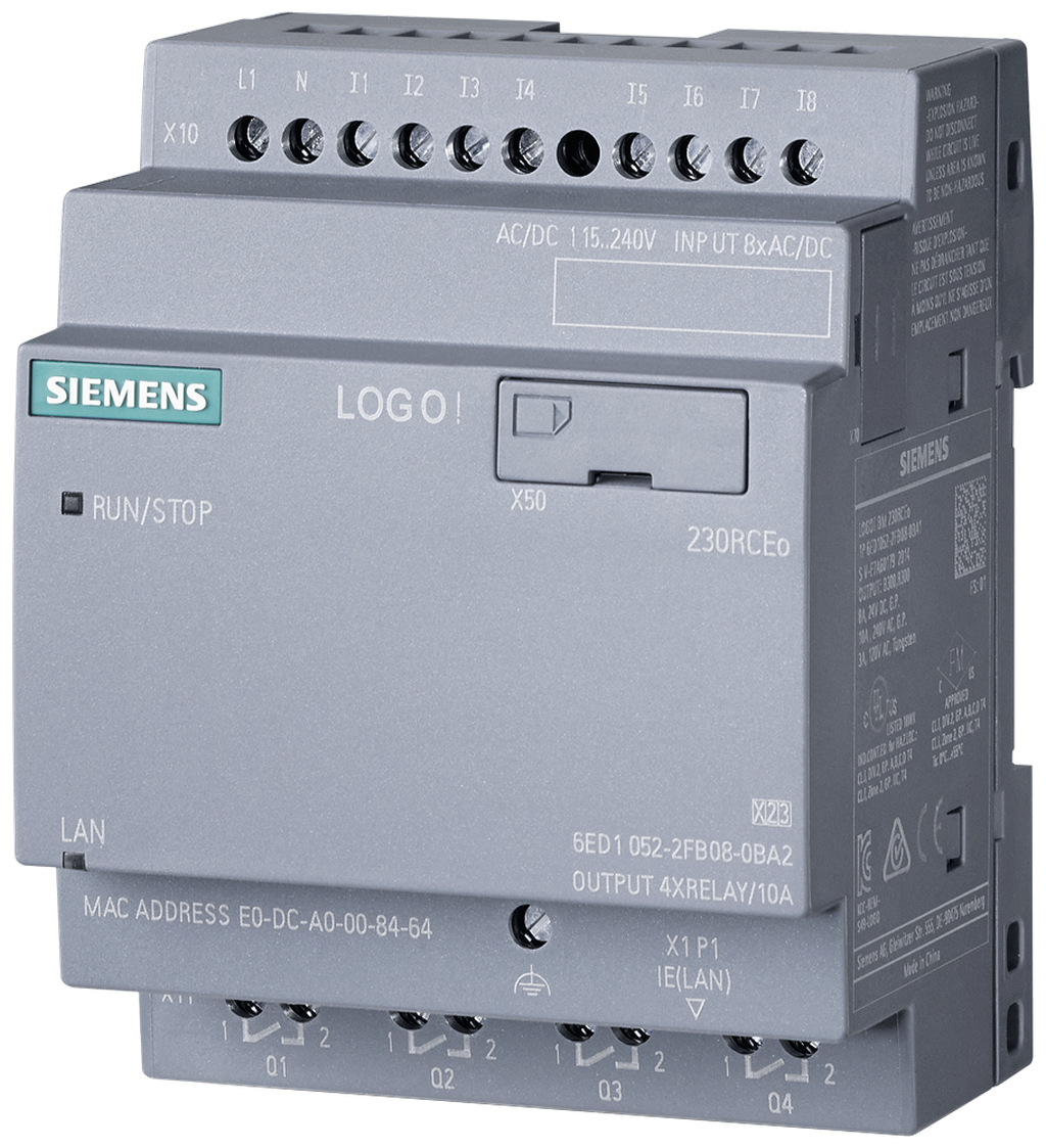LOGO! 230RCEO, logic module, PS/I/O: 230V/230V/relay, 8 DI/4 DO, without display, memory 400 blocks, modularly expandable, Ethernet, integr. web server, data log, user-defined web pages, standard microSD card for LOGO! Soft Comfort V8 or higher, older projects executable