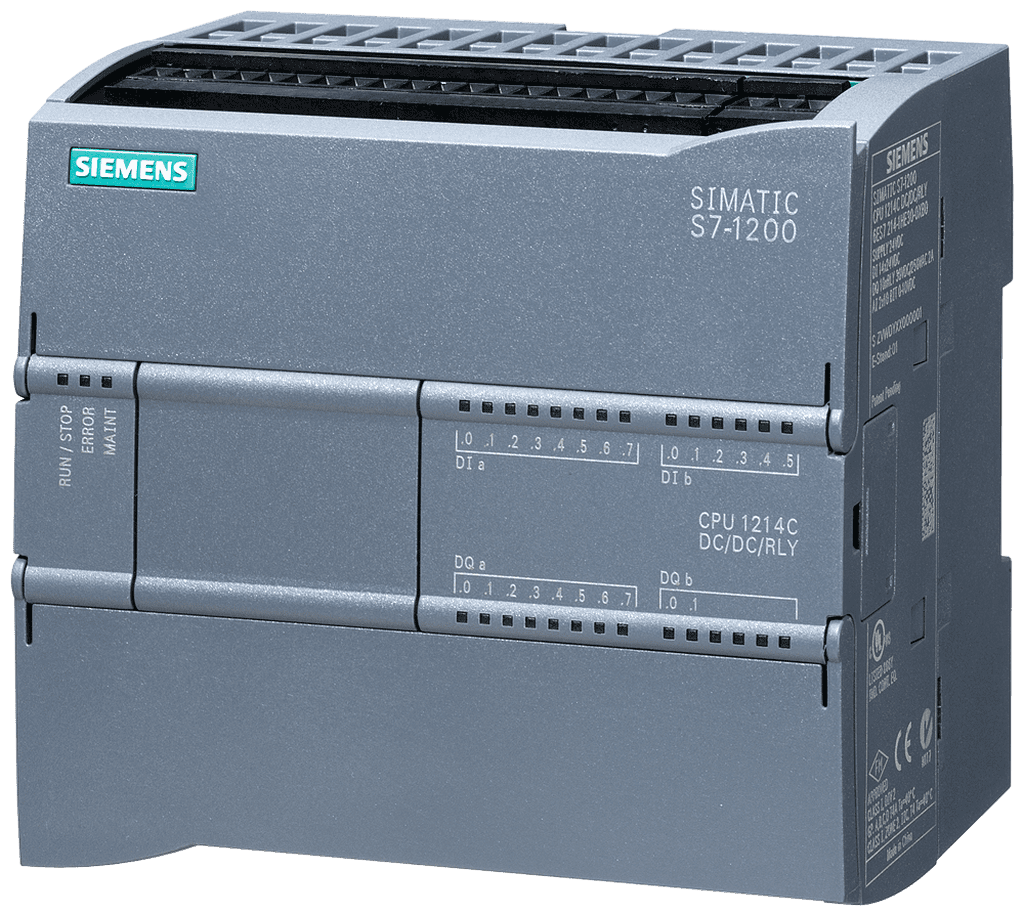 SIMATIC S7-1200, CPU 1214C, compact CPU, DC/DC/relay, onboard I/O: 14 DI 24 V DC; 10 DO relay 2 A; 2 AI 0-10 V DC, power supply: DC 20.4-28.8 V DC, program/data memory 150 KB