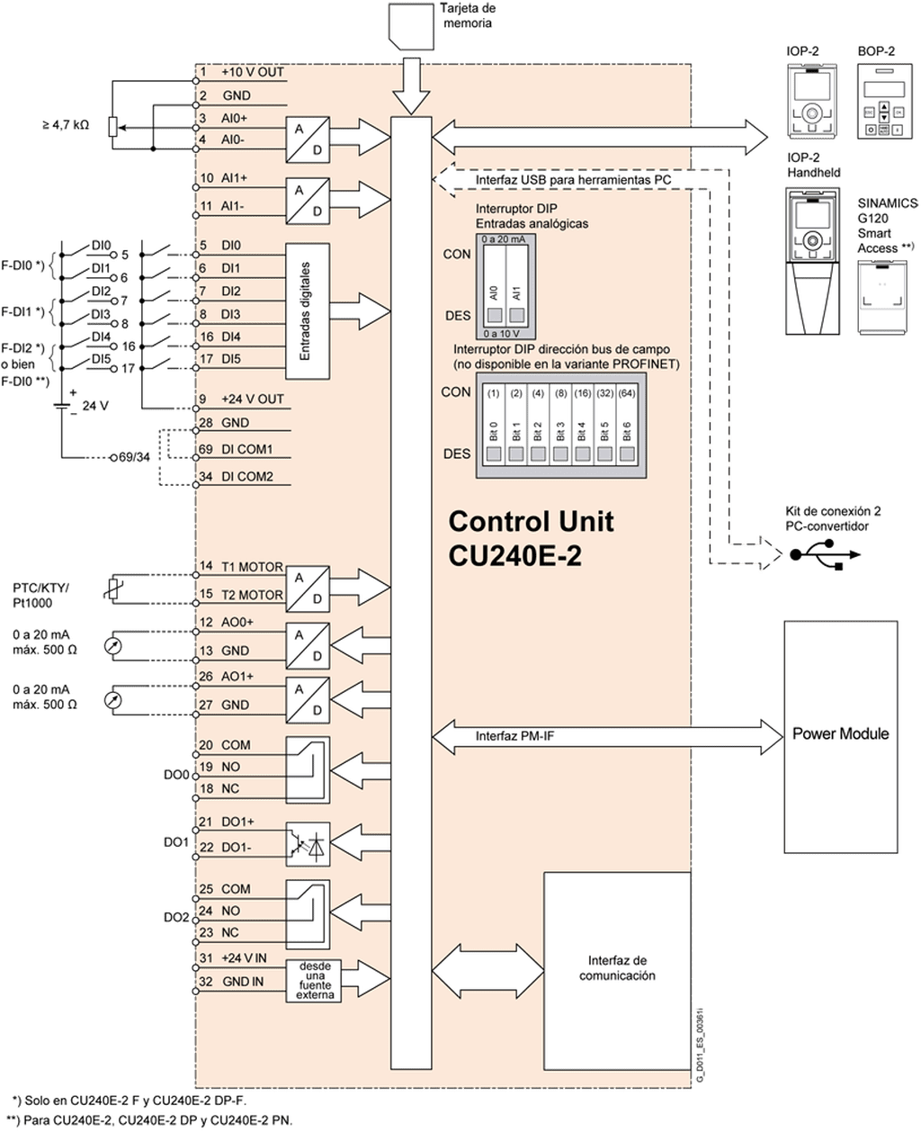 SINAMICS G120 CONTROL UNIT CU240E-2 DP E-TYPE SAFETY INTEGRATED STO PROFIBUS DP 6DI, 3DO, 2AI, 2AO, MAX 1F-DI PTC/KTY INTERFACE USB- AND SD/MMC-INTERFACE PROTECTION IP20 AMBIENT TEMP 0 TO +50 DEG C WITHOUT POWER MODULE AND PANEL